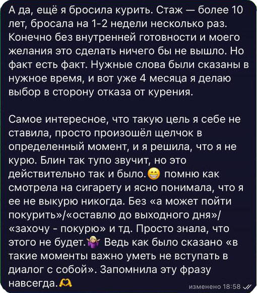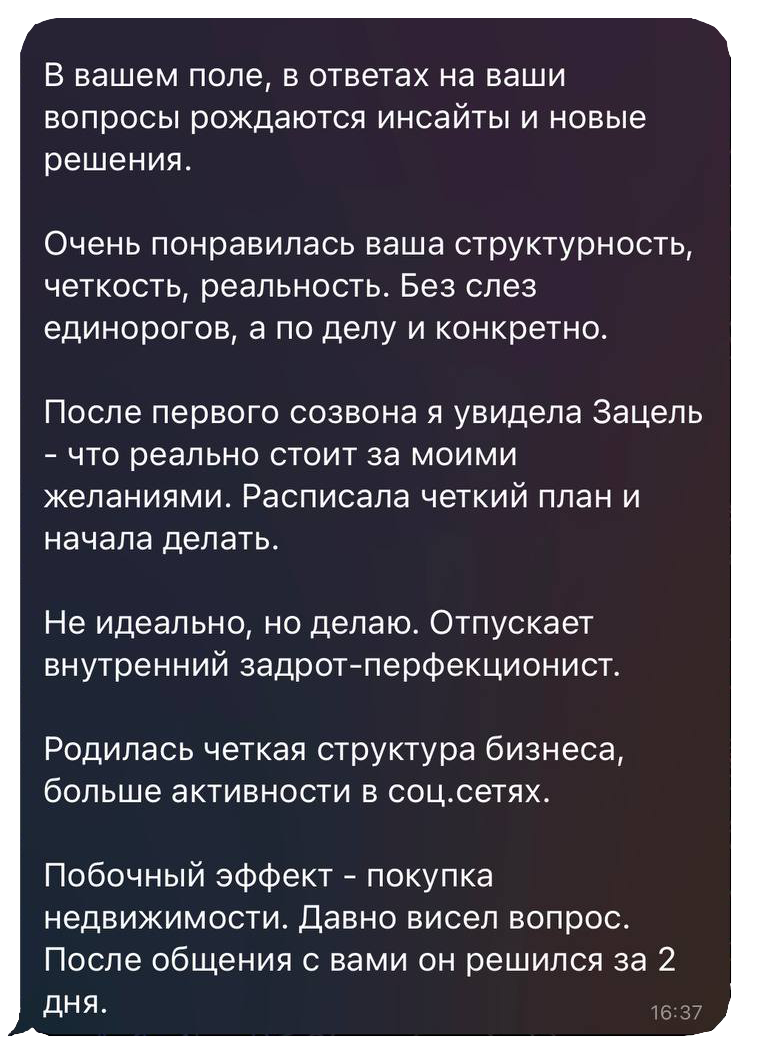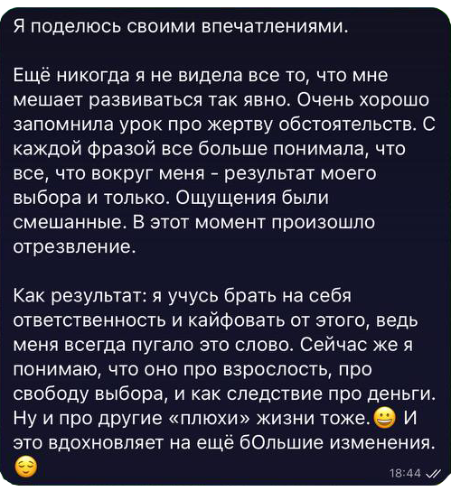 Все, чем мы делимся - смесь нашего опыта, изученных материалов и решений, которые сформированы в авторскую систему достижения целей. Вы получите и теорию, и задания для проработки дома, и самое главное - эфир с разборами ваших целей.